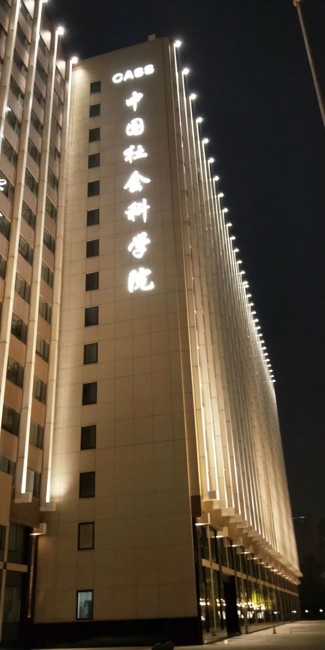 設置不同的場景模式可以讓夜色中的照明無需再在長時間內保持同一種過高的亮度照明需求,那樣所產生的電量也是沒有必要的。利用調光模塊可根據時間人流量大小來設定亮度,一鍵切換,方便快捷。下圖是社會科學院在夜色中的照明亮化。