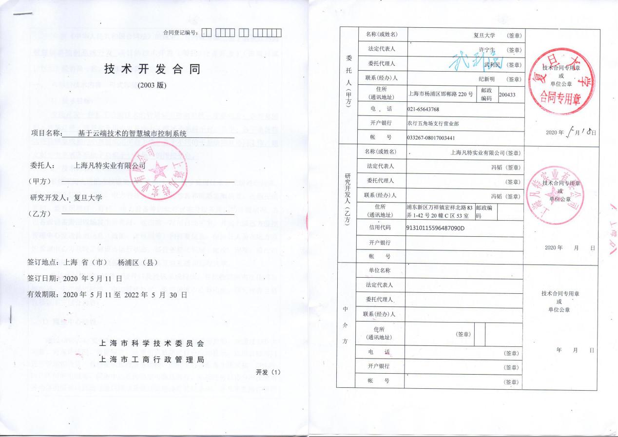 同年 5月11日,上海凡特實業(yè)有限公司正式與復(fù)旦大學(xué)簽訂《技術(shù)開發(fā)合同》——基于云端技術(shù)的智慧城市控制系統(tǒng)。項目將圍繞智慧城市開展科學(xué)研究、技術(shù)開發(fā)、成果轉(zhuǎn)化及文化交流等方面的合作。這次合作一面是能夠落實國家科教興國戰(zhàn)略,促進科技創(chuàng)新,加快企業(yè)經(jīng)濟發(fā)展,充分利用高等院校的技術(shù)、人力等資源以及先進成熟的技術(shù)成果。另一面,利用企業(yè)的生產(chǎn)條件,提高教學(xué)的科研能力,將科研成果盡快地轉(zhuǎn)化為生產(chǎn)力,不斷提升企業(yè)的技術(shù)和管理水平,雙方發(fā)展各自優(yōu)勢。上海凡特通過多種形式開展全面合作,共同推進公司與復(fù)旦學(xué)校的全面技術(shù)合作,形成專業(yè)、產(chǎn)業(yè)相互促進、共同發(fā)展,努力實現(xiàn)“校企合作、產(chǎn)學(xué)雙贏”!