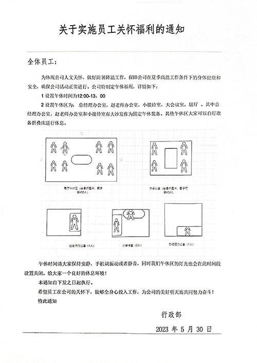 公司設(shè)置了午休區(qū)并購置了"午休神器",神器寬大柔軟,如折疊睡墊;配備的緩解頸部勞累的充氣枕,釋放了上午工作的疲勞。讓員工在午休時間休息好,養(yǎng)足精神,不是一件小事。該通知讓員工感受到了企業(yè)大家庭的溫暖,也是企業(yè)人文關(guān)懷的真情體現(xiàn),獲得大家的一致好評點贊,也使得下午的工作更加投入用心。