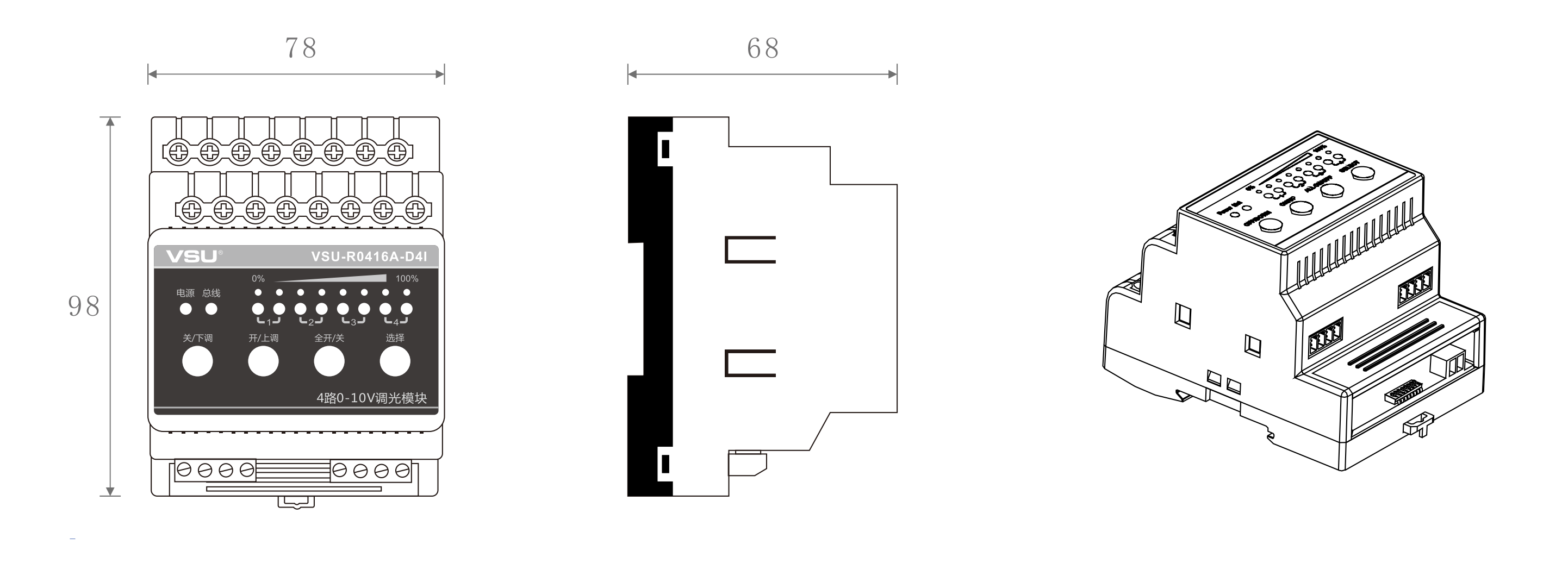 本產(chǎn)品為導(dǎo)軌式安裝,含4路智能繼電器可獨(dú)立控制4路3300W燈具的開關(guān),4路0-10V調(diào)光接口配合0-10V調(diào)光變壓器可對日光燈、LED燈等燈具調(diào)光; |